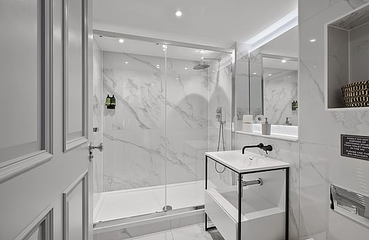 The modern ensuite boasts a large walk-in shower, basin and WC.